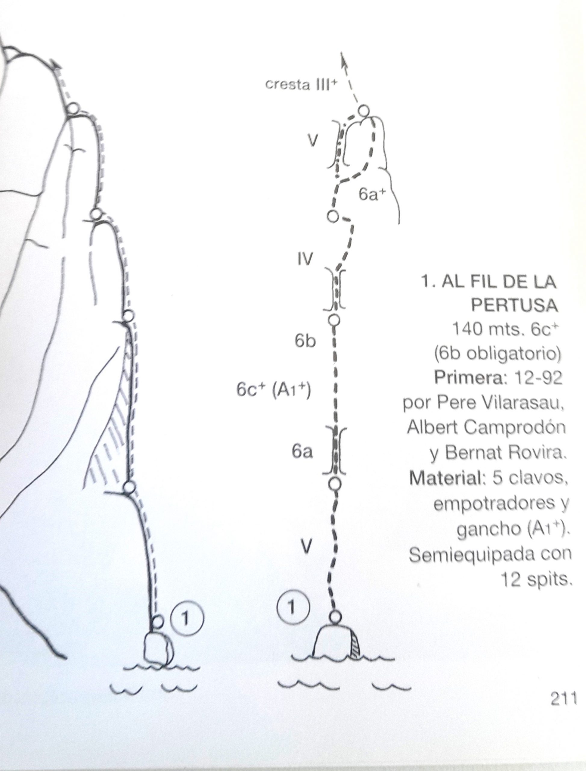 Estamos a mediados de septiembre del 2002 y a las puertas del otoño. El ambiente es cada vez más frío y los días más cortos. Barajamos opciones algo más cortas que las rutas de la Paret de Catalunya. Abrimos la guía, hay una vía que va por todo el espolón afilado de La Pertusa que nos llama mucho la atención. No tenemos información de otras repeticiones. Pide clavos pero no los vamos a llevar, los ganchos sí.