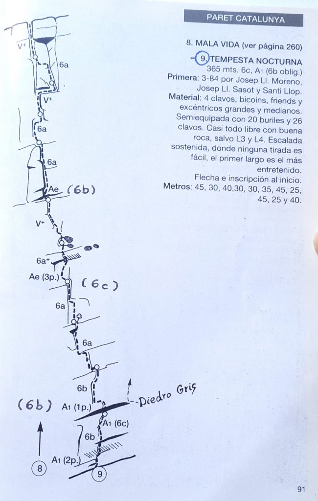 Es 24 de octubre de 2004, me despierto en el Prado de la Paret de Catalunya, aun con la imagen del cielo tan limpio y estrellado de la noche pasada. Los bivacs aquí siempre tienen el mismo sabor: silencio, millones de estrellas y algo que recorre tu cuerpo diciéndote que la actividad de mañana va a ser curiosa. Ayer hice la Desequilibrio Hormonal 250 m, 6c (6b+, A1. 6a+obligado) con Xavi Bustamante y Víctor Esteve. Aunque no me tocaron los largos difíciles, pude hacerla de segundo toda en libre. Luego vinieron Juani espuny y Álex García para hacer hoy el Diedro Gris. El ambiente fue bueno, casi todos vivimos en Monistrol de Montserrat. Parecía una reunión de amigos en la plaza del pueblo. Nosotros vamos a ir a la Tempesta Nocturna 365 m, 6c (6c, A1. 6b obligado), así que nos vamos a ver en los primeros largos.