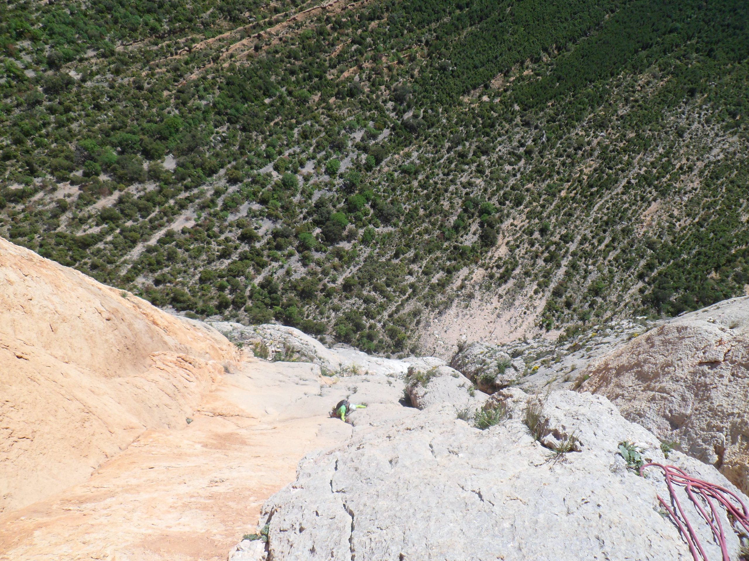 Empezamos la ruta, el Primer largo es duro en frío, me parece un buen 6c, quizás más. El segundo lo encuentro más fácil, seguramente 6b, se trata de superar un techo con canto. El quinto largo me parece 6c y el séptimo más fácil, 6b.