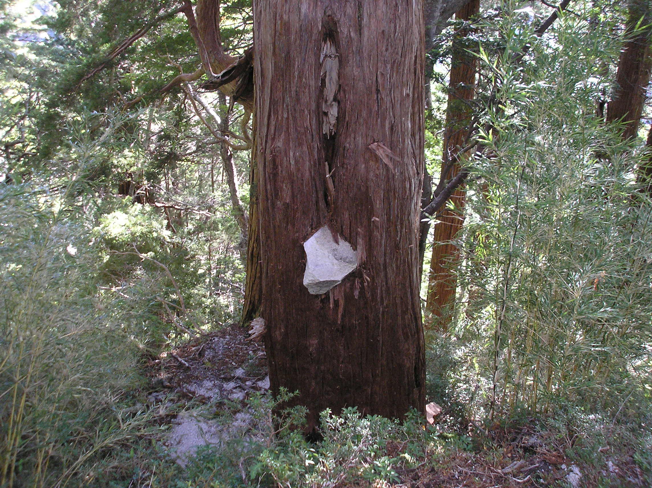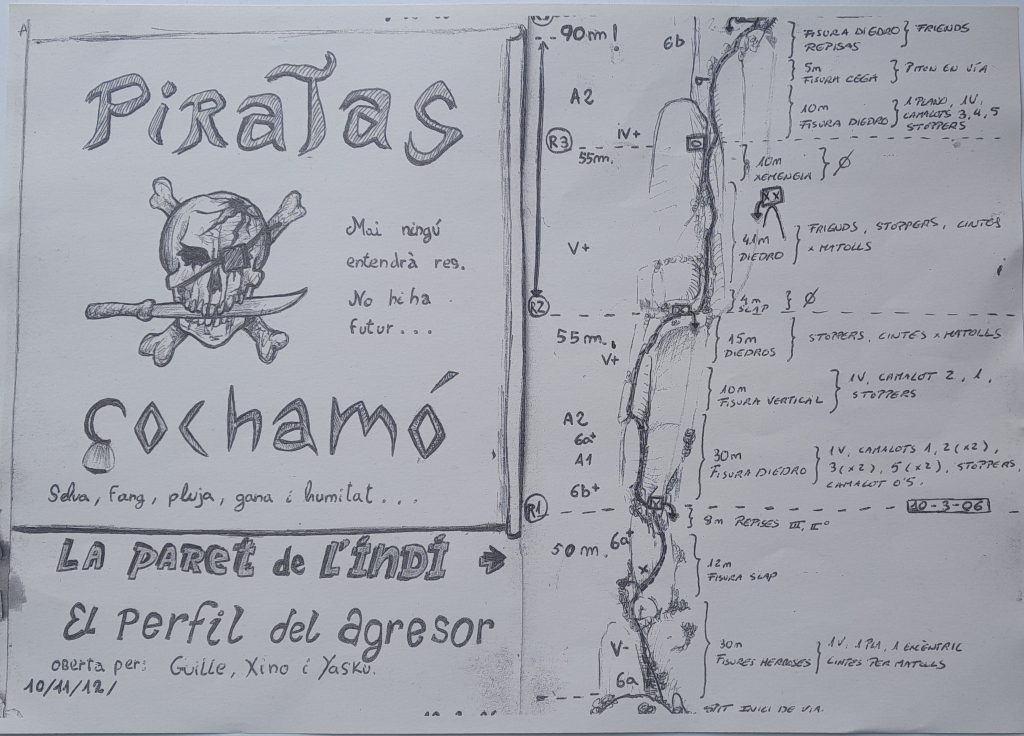Durante estos días de mal tiempo, conseguimos abrir camino hasta la pared de enfrente, que acabamos bautizando como Pared del Indio, por la forma de cara mirando hacia La Junta. Cuando llegamos, nos llama la atención una piedra del tamaño de un televisor incrustada en un árbol. Más arriba, en la pared, podemos ver un sistema de fisuras muy atractivo y una repisa en medio de la pared que le llamamos Plaza Cataluña.