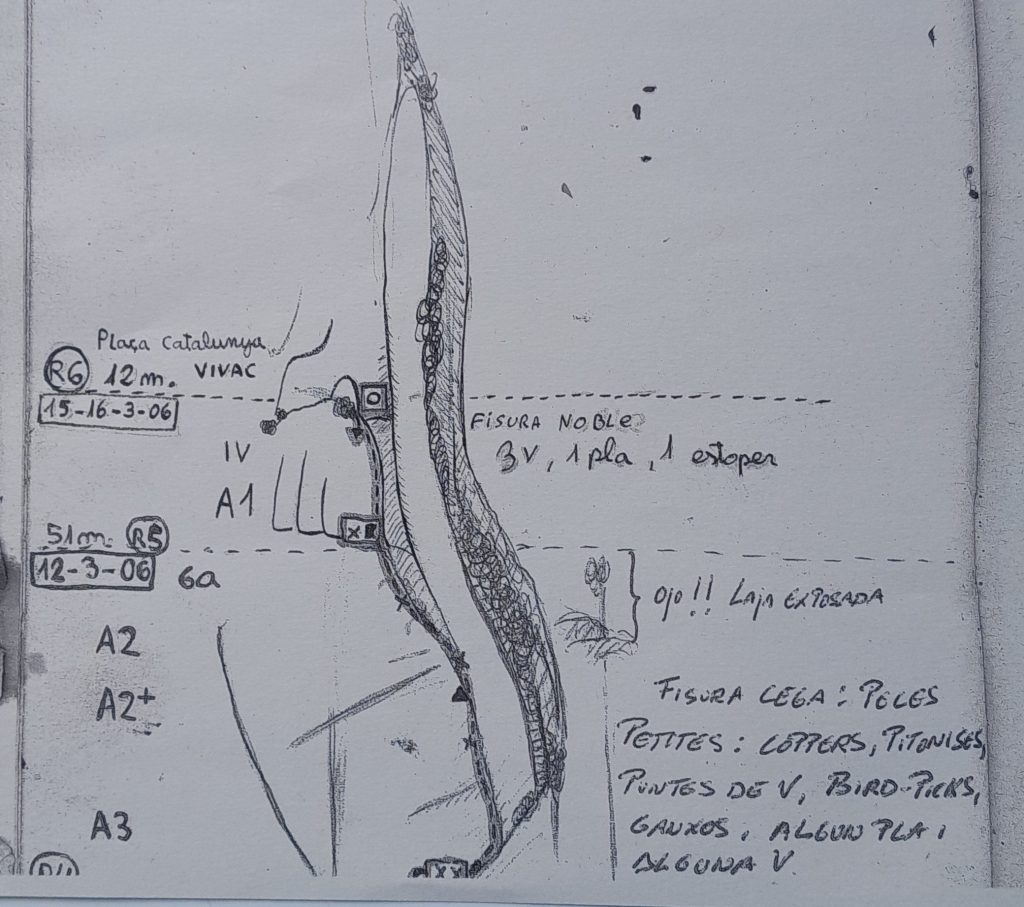 . L4. 90 m,6b/A2: escalar la fisura diedro que se vuelve ciega durante unos metros. Luego superar un pequeño desplome protegido por un clavo. Seguir las repisas herbosas hasta la reunión bajo el muro vertical.
