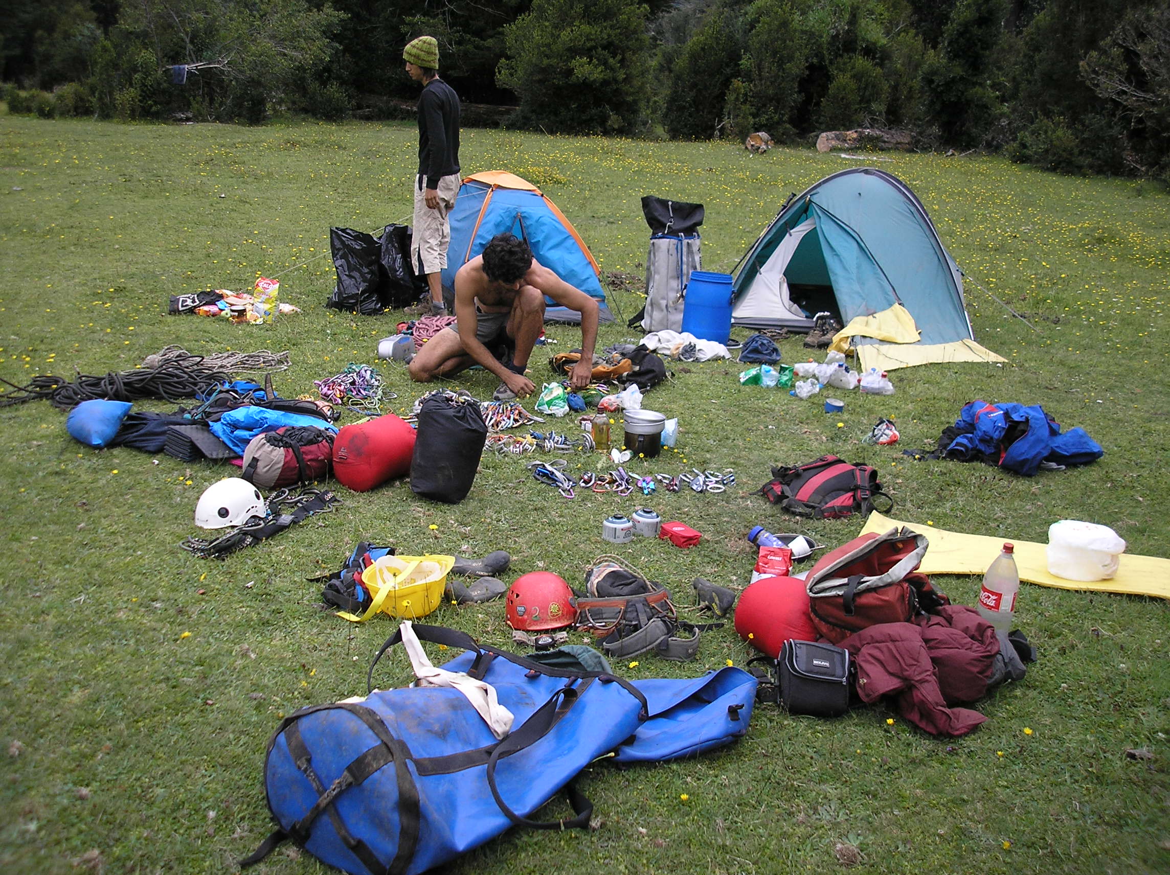 Al llegar al refugio, se ven chorreras por todas partes. Nuestra sospecha se confirma, aquí ha llovido mucho. Vamos a conocer a Dani, el dueño de la finca, que muy amablemene nos ofrece los servicios de camping. El lugar es increiblemente bonito: selva, paredes, agujas y cascadas por todas partes. Montamos la tienda y nos vamos a hacer el segundo porteo.