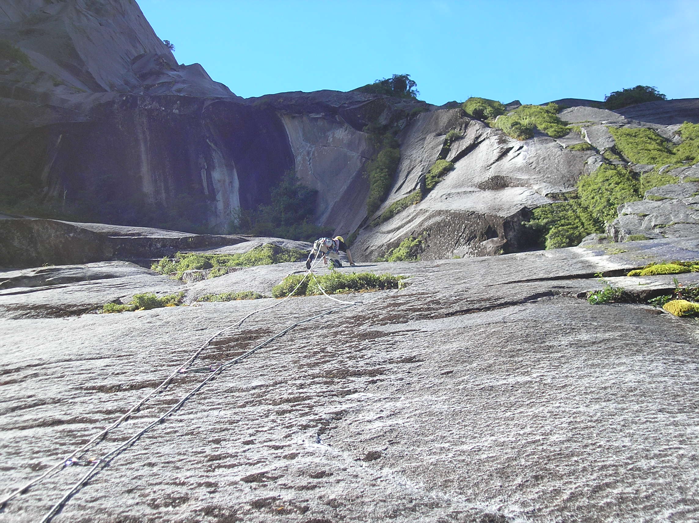 El 21 de febrero, nos vamos al Cerro La Junta, a la vía Viaje a la Luna creciente 1077 m, 7c (7a, A2. 7a obligado). Esta vía aun no tiene repetición. Monto el primer largo, un 7a de slab de 60 metros. Acabo patinando, es difícil y está húmedo, es el 7a obligado. Cuando llego a la reunión se pone a llover, fijo una cuerda y volvemos al campamento.