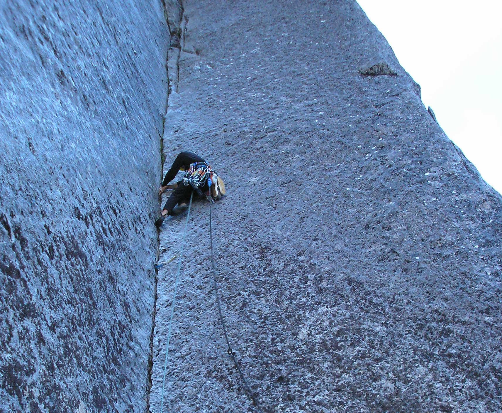 . L2. 55 m, 6b+/A2: seguir por el diedro de la izquierda, escalar la fisura vertical hasta unos diedros más fáciles.