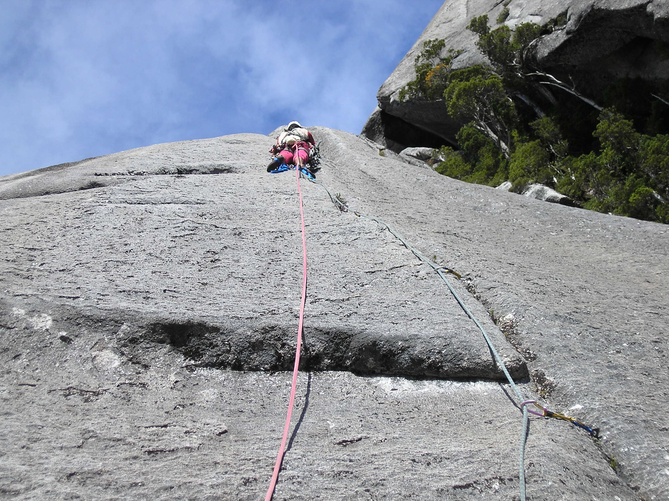 . L6. 12 m, 4+/A1: continuar por la fisura, ahora más amable, hasta la repisa.