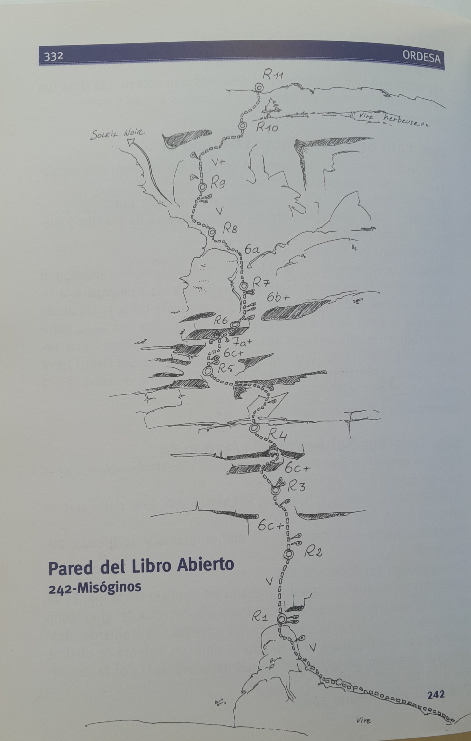 El 5 de julio de 2007, a primera hora ya estamos en pie de vía de la Misógenos 400 m, 7a+/7b (6c, A2 obligado) en la Pared del Libro Abierto, es una vía difícil con algún largo expuesto. Me motiva mucho las pocas expansiones que tiene y el grado en libre que pide. Yo estoy dispuesto a darlo todo. El largo clave de 7a+ desploma mucho, me parece muy físico, consigo ir empotrando rodillas a la vez que practico la autoprotección. Haber estado unos días en Rodellar me ha dado muy buena transferencia. Al final de los techos hay un paso de bloque con lance y lactato incluidos. El resto de largos son también increiblemente buenos. Hacemos también toda la vía a vista, el abrazo en la cima es cada vez más fuerte.