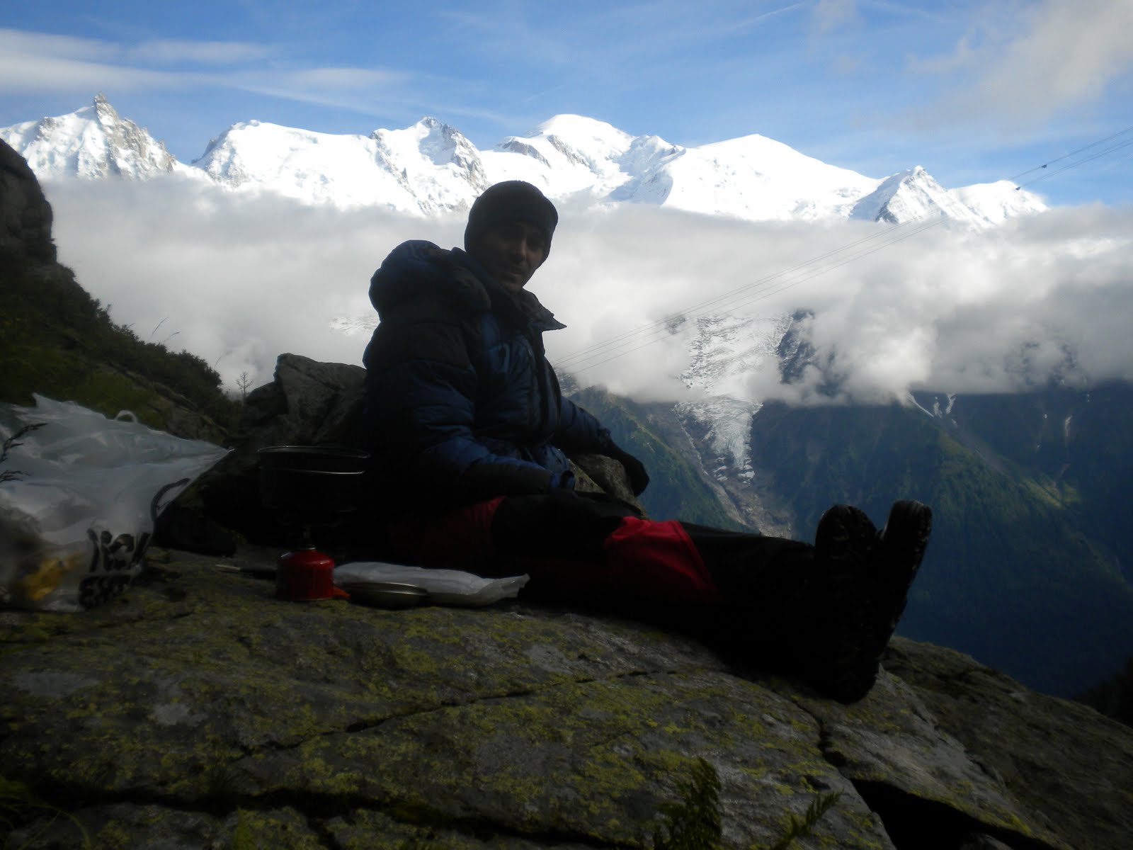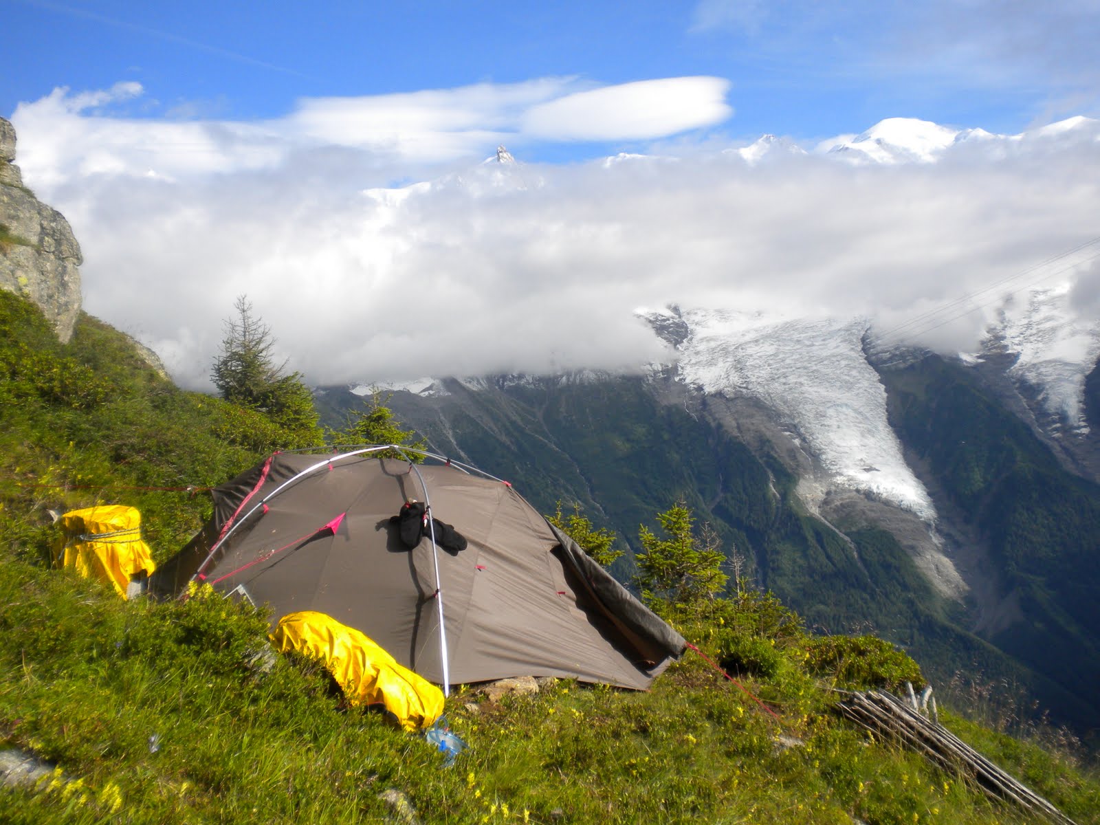Es 20 de julio de 2011, dicho y hecho, estamos en la meca del alpinismo; teleféricos, muchos turistas y, como siempre, el tiempo es horrible: tormentas de verano cuando llega la tarde. El plan va a ser aprovechar las mañanas para escalar y rfugiarnos por la tarde. Nos vamos a la Brevent,cerca de la estación intermedia, y plantamos latienda para pasar unos días.