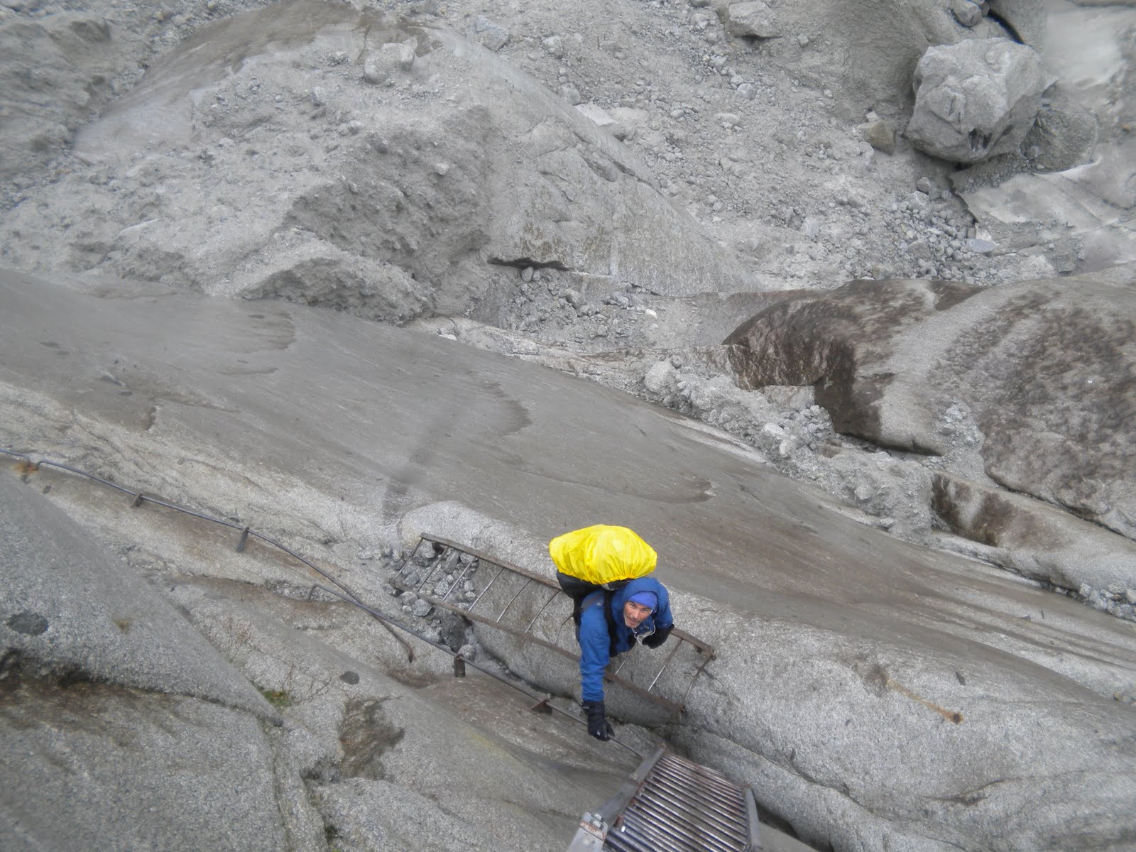 Luego volvemos al camping Les Arolles donde estamos un par de días de mal tiempo. Parece que a partir del 29 de julio viene buen tiempo. Así que el 28 de julio de 2011 hacemos los petates y subimos lloviendo al refugio de Envers. Tanto el descenso de la ferrata de Montenvers como el ascenso de la de Envers se nos hace un poco expo con todo mojado y cargados como vamos.