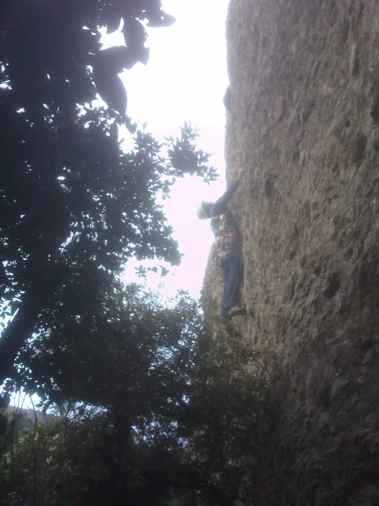 El mismo día, puedo abrir una variante trad de la vía Fullaraca 6c. Subo, con la ayuda de un árbol, por la izquierda hasta una pequeña bauma para salvar la placa lisa. Consigo enlazar un puente de roca. Luego hasta la segunda bauma donde dejo un empotrador fijo. Sigo hasta la veta de arenisca de mitad de la pared, luego sigue la vía equipada del 6c. Para abrirla utilizo un juego de friends del # 0,1 al 2 y un juego de C3.