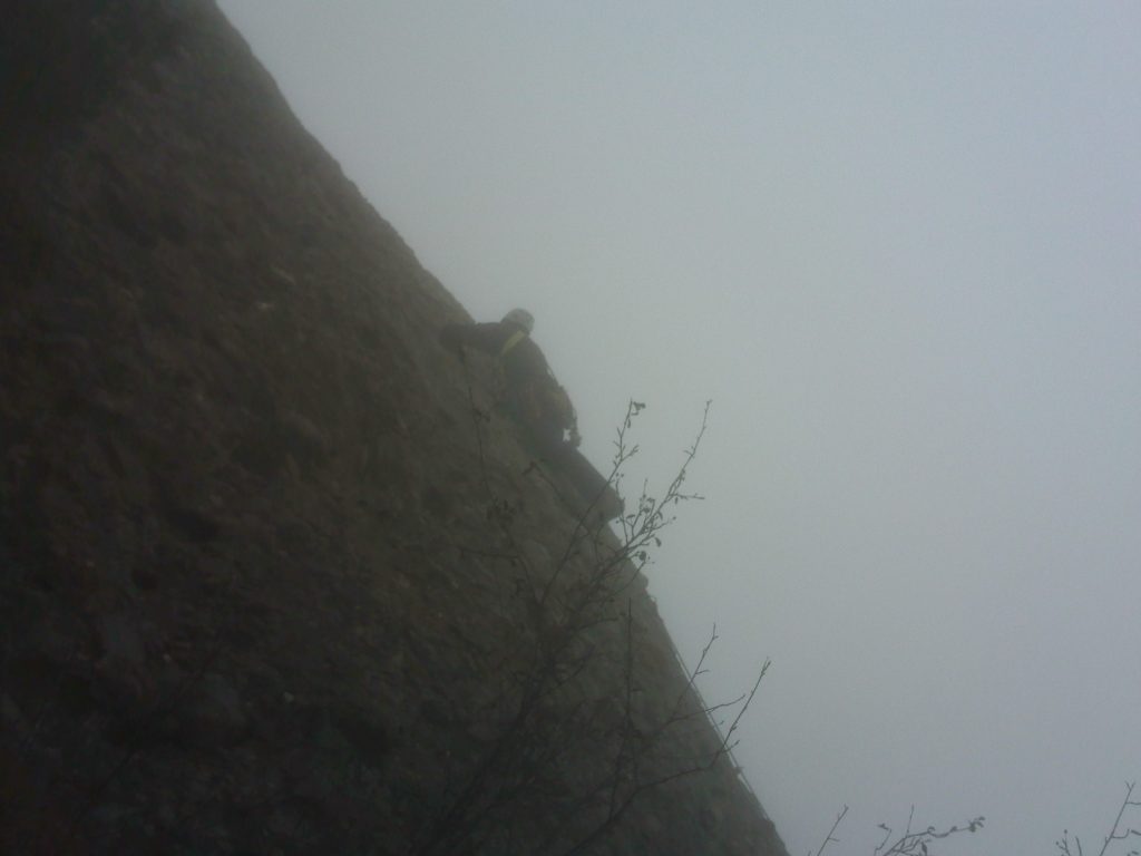 El 28 de enero de 2012, volvemos los mismos, el día es igual que el anterior, frío y húmedo. Ellos me animan a acabarla, vuelvo a subir, llego al #2 desde el que me bajé, paso el run out, luego puedo puedo colocar un #4, la línea de cantos me lleva otra vez hacia la izquierda y recto hasta la cima. Aseguro a Fernando desde la sabina de la cima, él la desmonta y se reúne conmigo, confirma el 5+. Una primera en trad que hubiera sido muy poco interesante equipada con bolts pero que ha resultado ser excelente en este estilo tan puro. He utilizado un Juego de friends del #0.3 al 4, doble del #1 y 2. Una de las primeras vías que abro en estilo tradicional en Montserrat. Ahora, como un cuadro caprichoso que pintas y borras, solo se ve el magnesio que hemos dejado y algún cordino colgando.