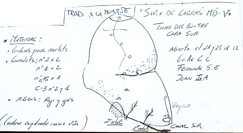 Un día, subiendo para probar Múrgola en La Trumfa, me paré en el Mirador y me fijé en su cara oeste, parece que es de la misma calidad que el resto de roca del sector y se ven muchos agujeros. He bajado varias veces para hacer las vías de este tocho, pero la verdad es que nunca me había fijado en sus paños vírgenes. El 25 de enero de 2012 me acerco con Fernando y Joan, la niebla es densa y el día muy frío, escalar en el tocho del Buitre puede ser idóneo. Una vez abajo, me decidido a abrir una nueva ruta por la línea que vi, llevo un juego de autoprotección a base de friends, empotradores y cordinos para enlazar merlets. Desde el pie de vía, subimos por la canal de la izquierda y a la altura del segundo árbol veo la entrada más lógica. Emplazo un puente de roca desde el suelo, es para marcar el inicio, luego consigo emplazar un friend del #1 y 2 puentes de roca más. Llego a un labio de arenisca que forma una bauma, ahora hay un run out para ir a izquierda y luego volver a derecha. No consigo pasar, el día no me invita, decido bajarme desde un par de piezas.