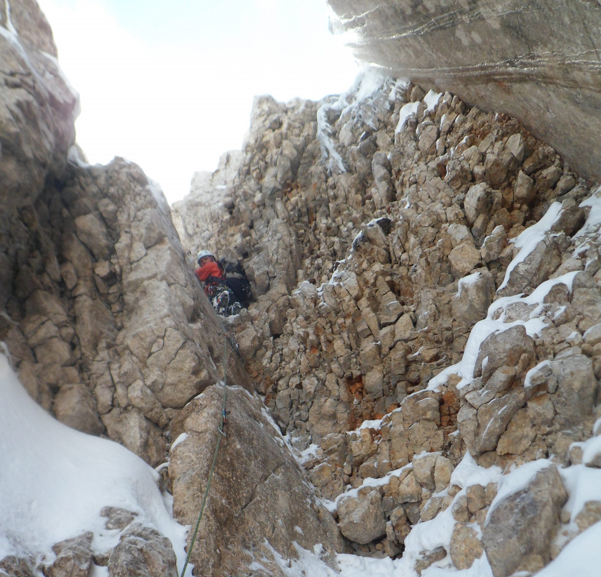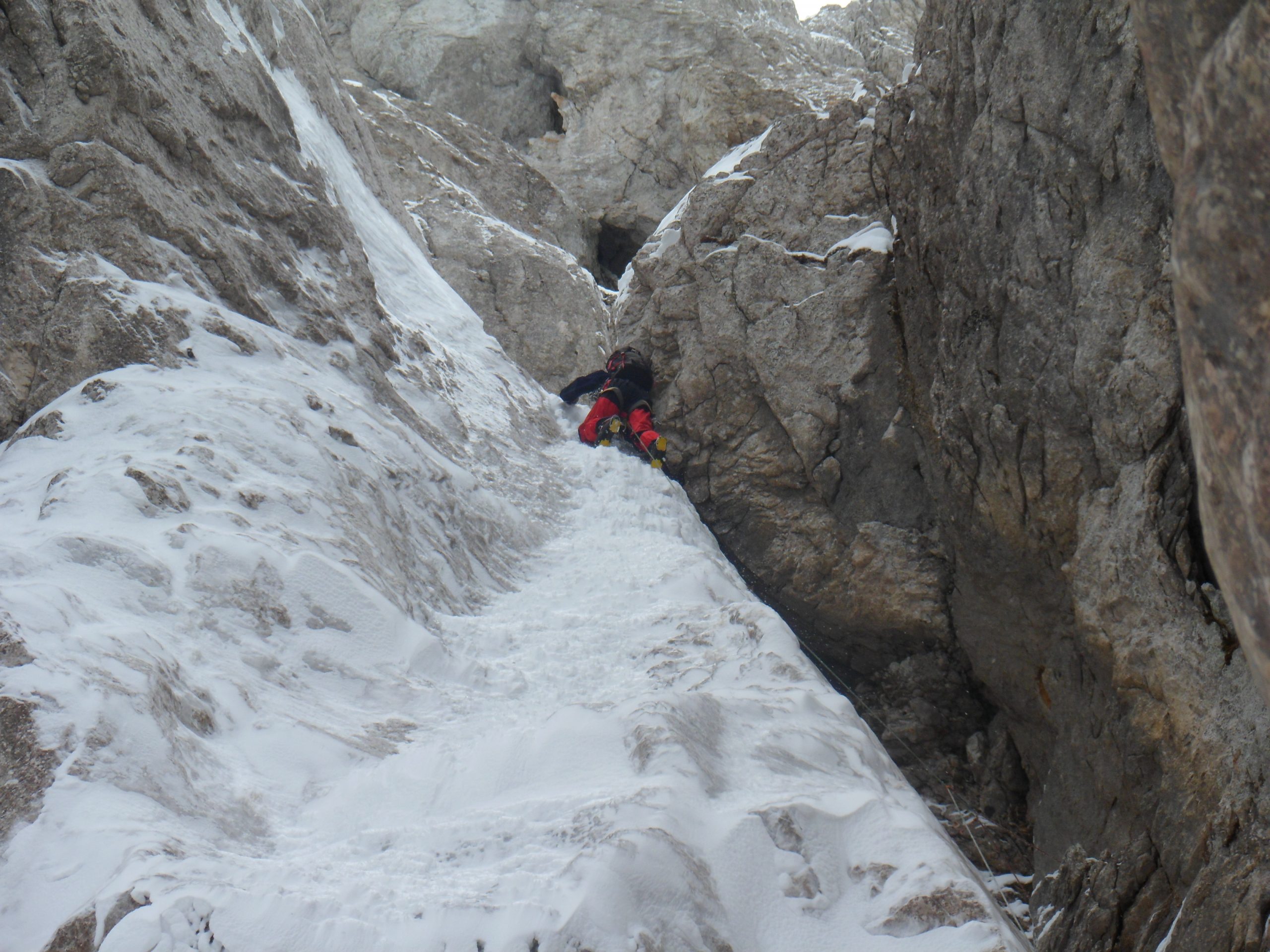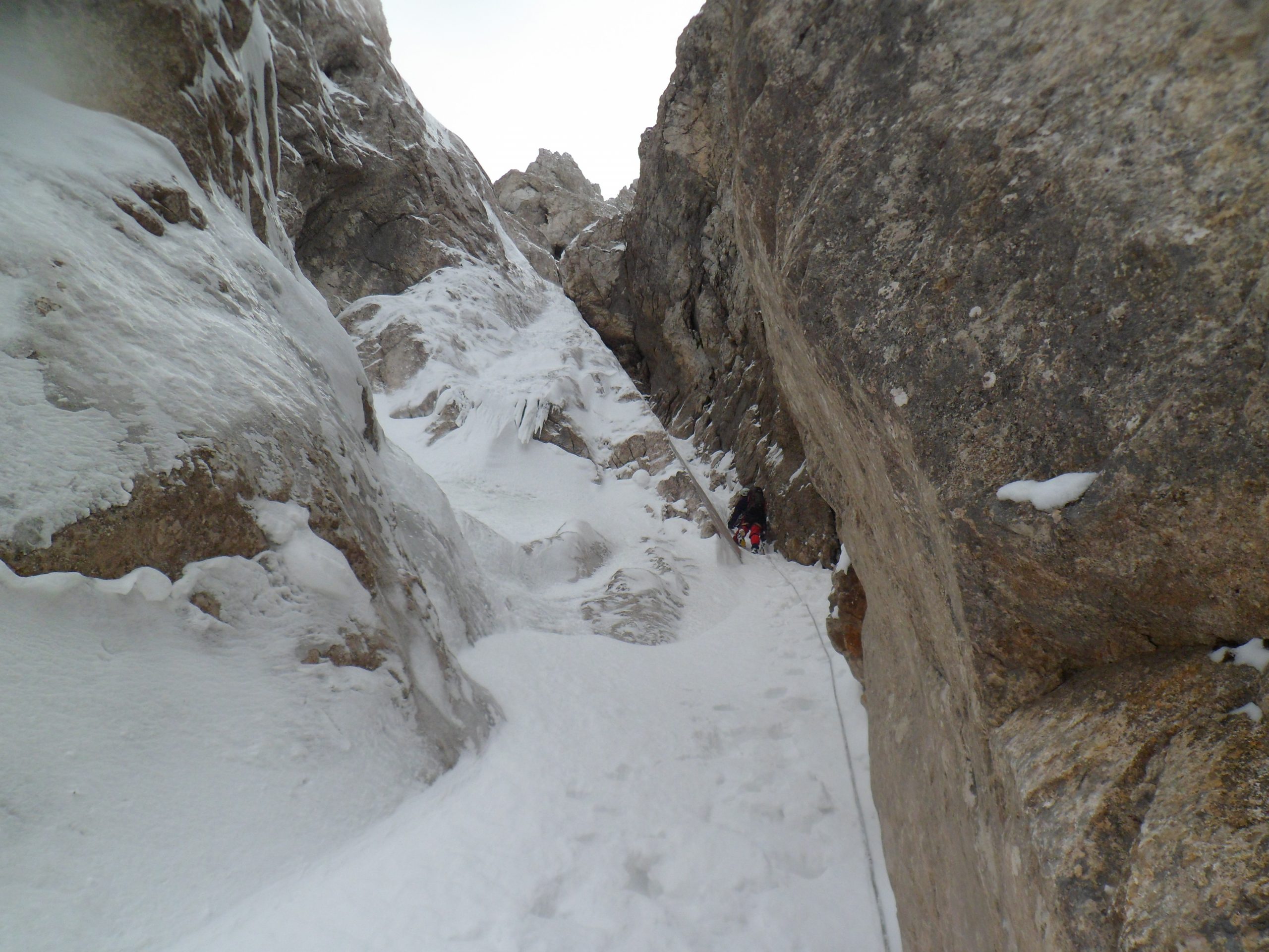 Desde la reunión se puede ver el segundo largo: es una chimenea helada. David supera un paso estrecho a 75º y se mete de lleno en la chimenea a 85º. Después de hacer varias acrobacias a piolet tracción, llega bajo un techo donde monta R2. Ahora salgo por la derecha del techo superando un muro a 80º de difícil protección. Luego un corredor a 50º hasta el pie de un muro vertical seco donde monto R3.