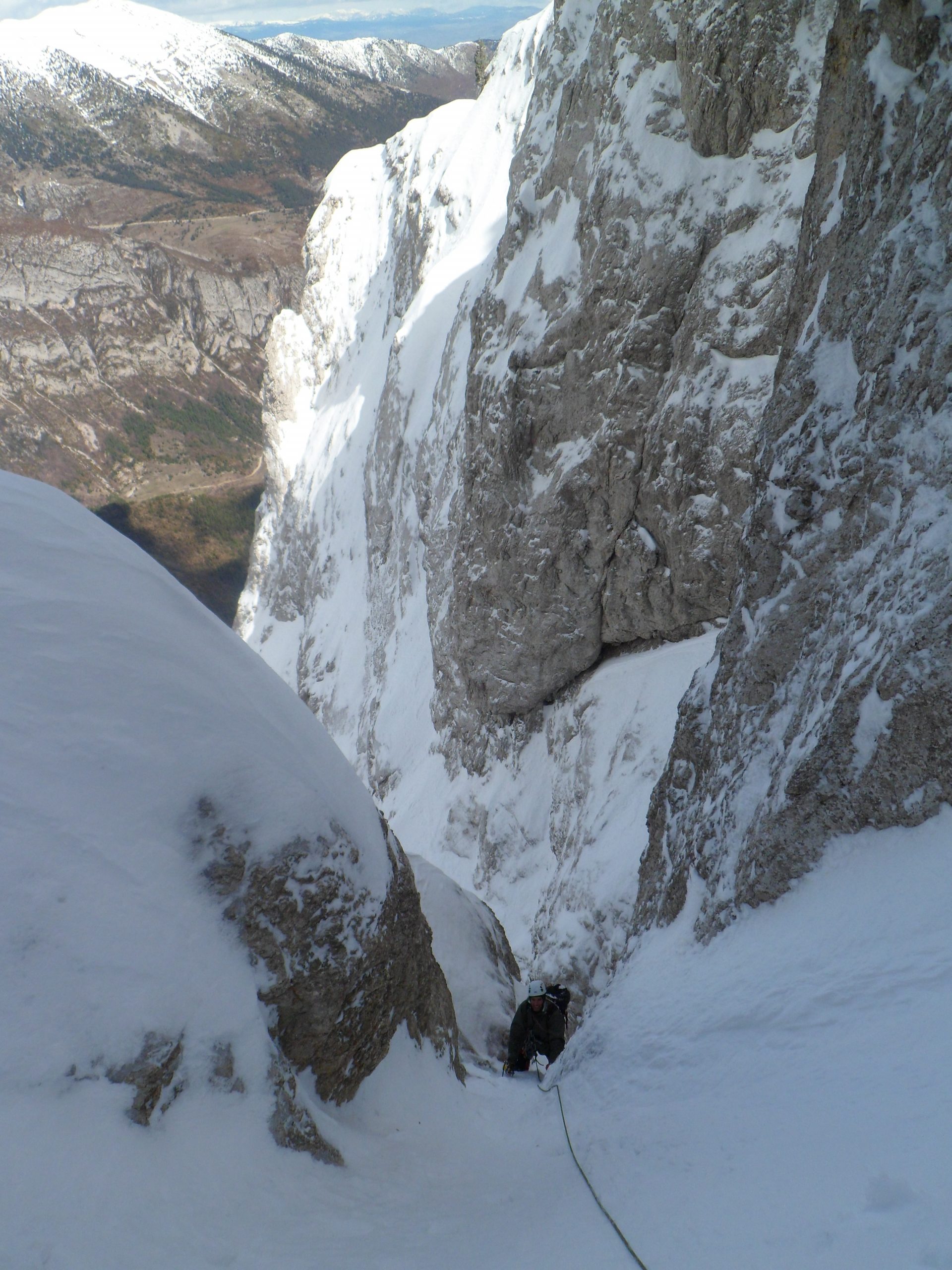 Luego, subimos por un corredor a 55º hasta la cova del Riambau a pie de un diedro donde montamos R0. Escalo el diedro, y antes del gran techo me salgo por el espolón de la izquierda a buscar el grosor del hielo. El muro está a 75º y paso a penas clavando 1 centímetro las herramientas punzantes. En uno de los senos helados, consigo emplazar un tornillo, lo paso un poco mal. Luego, más fácil, sigo una campa de nieve a 55º hasta un punto débil rocoso donde monto R1. Ha sido un largo brutal.