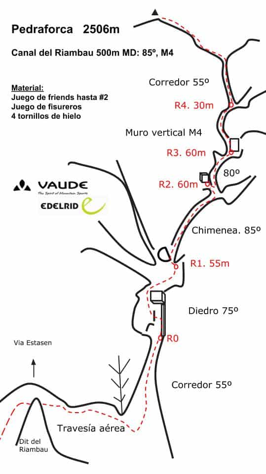 La Canal del Riambau es una clásica ruta de roca que ofrece, durante los meses secos, una forma muy elegante de alcanzar la cima del Pollegó superior del Pedraforca 2506 msnm. Sin embargo, en invierno, se convierte en una manera esplendente de subir para el escalador ávido que espera ansioso las buenas condiciones nivales. Como pasa en la mayoría de clásicas de este macizo, que antiguamente se escalaban en invierno, esta ruta necesita unas condiciones algo extraordinarias para su formación.