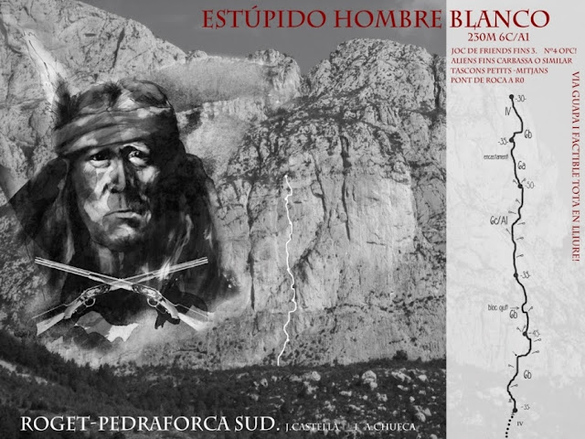 «Estúpido hombre blanco» 230 m, 7b+ (6b+/A1 oblig.): primera en libre y a vista en el Roget, Pedraforca
