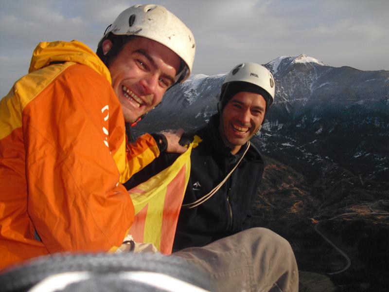 Llegamos al aparcamiento del Roget, subimos rápido, damos con el inicio de la ruta en seguida. Albert maneja los largos para ofrecerme el que no está hecho, yo acepto gustosamente. Hacemos los 2 primeros largos, los pitones emplazados ayudan a ir muy rápido. Llegamos al tercer largo, el clave, quizás la razón por la he venido hasta aquí. Es una fisura desplomada, una columna hueca me hace dudar, llego al final de la fisura, hay 2 pitones juntos que marcan un flanqueo a la derecha. Ahora hay un desplome con paso de bloque incluido a superar, la roca es muy buena. Con algún pie precario consigo hacer la sección y el largo a vista. Me parece 7b, Albert desmonta el largo y llega a la reunión , se ha colgado un par de veces , dice que puede ser 7b+. Lo dejamos de 7b+. Sea el número que sea, es un largazo. No es expuesto ni obligado pero ha valido la actividad a este muro.