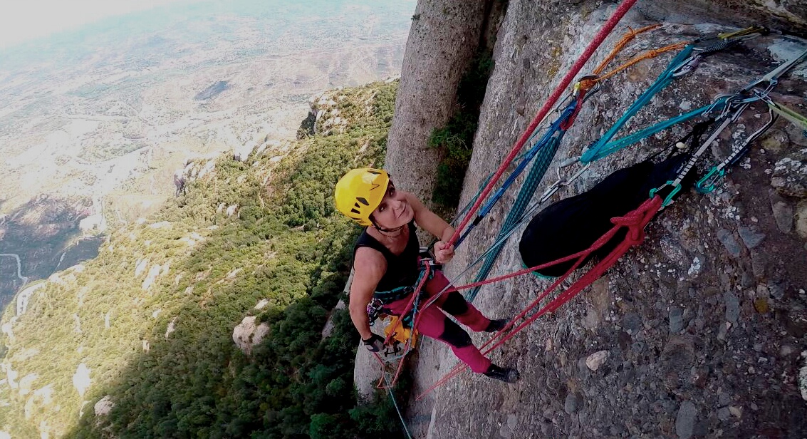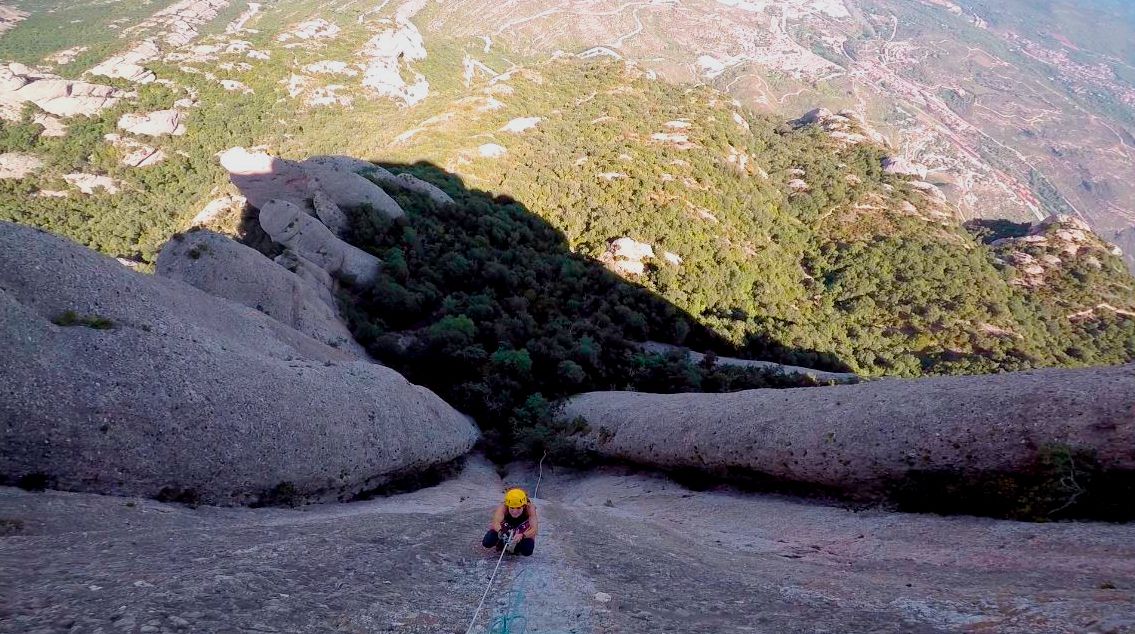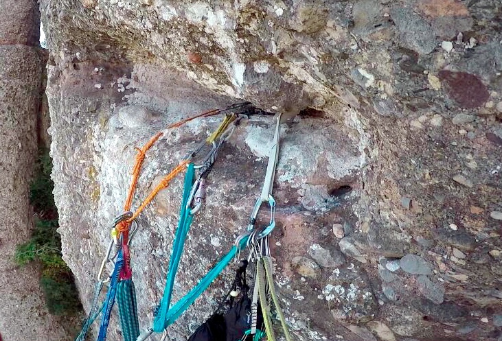 «Bóreas» 130 m, 8a ABO+ (7b oblig.): una primera trad en La Punxa, Els Flautats. Montserrat norte