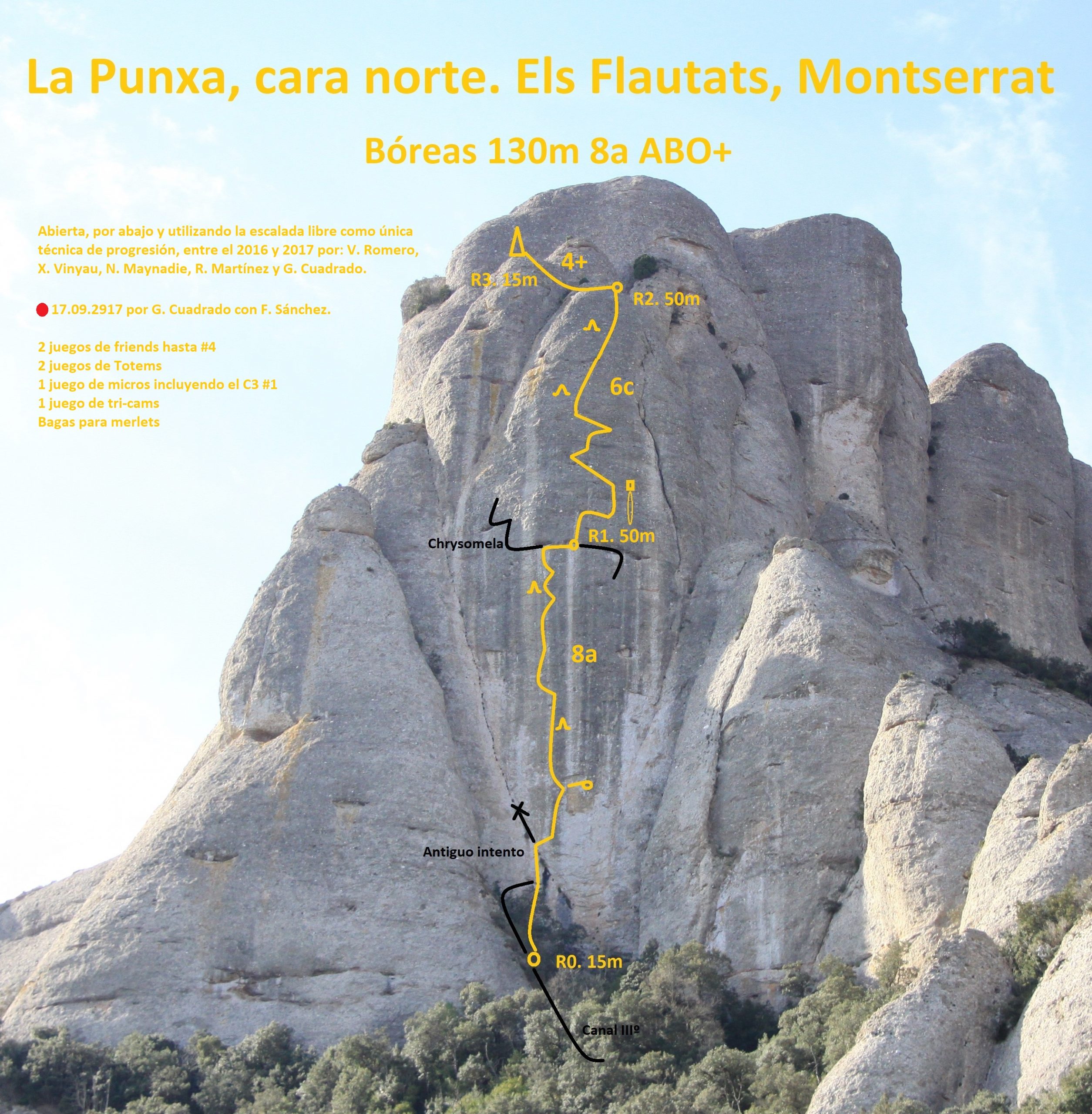 El 11 de junio de 2016, aprovechando un encuentro de escalada tradicional en el que solo asistimos Xavi Vinyau y yo, empezamos a abrir en la cara norte de La Punxa. Entro por un antiguo intento de buriles que muere en el inicio de una fisura hcia la derecha. Este punto va a ser clave para intentar flanquear hasta el desplome del muro principal. Tras varias caídasde dos empotradores ecualizados consigo solucionar el paso de bloque hasta llegar a un agujero dode puedo colocar un totem verde. Luego recto, en escalada más atlética llego a una especie de fisura ciega. Sin posibilidad de protección, intento continuar por el desplome hacia unos bolos, pero una caída aquí podría ir al suelo. Grimpo y desgrimpo sin éxito hasta que desisto y bajo al suelo.
